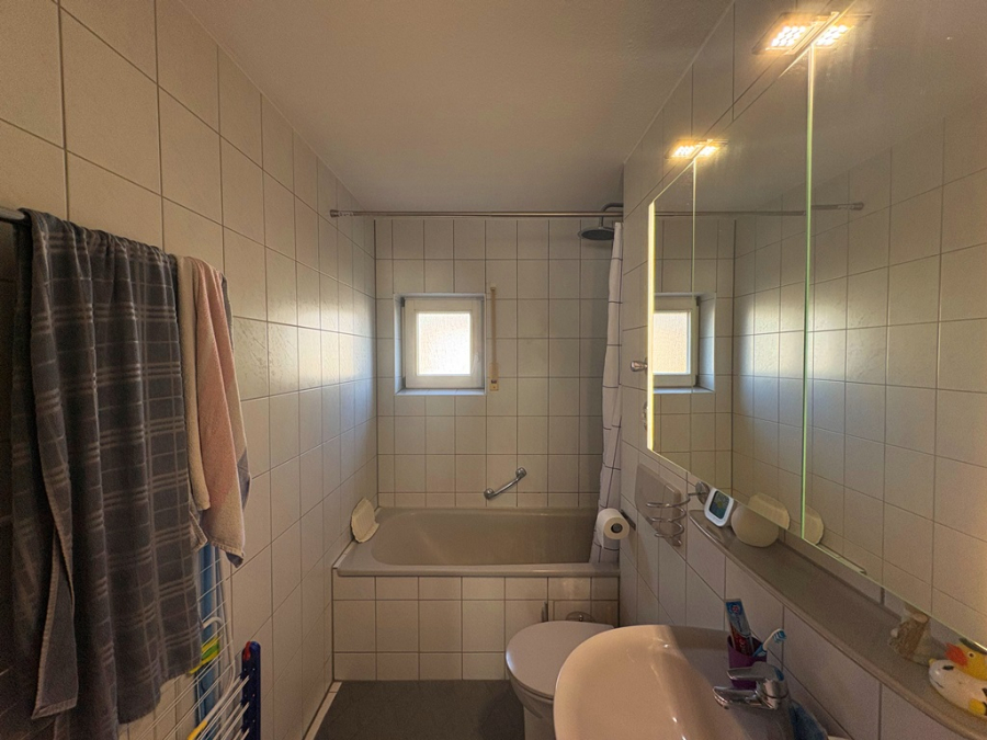 - Badezimmer mit weißer Sanitärausstattung, raumhohen Fliesen, Wanne mit Dusche, Waschbecken, WC, Spiegelwandschrank und Waschmaschinenanschluss